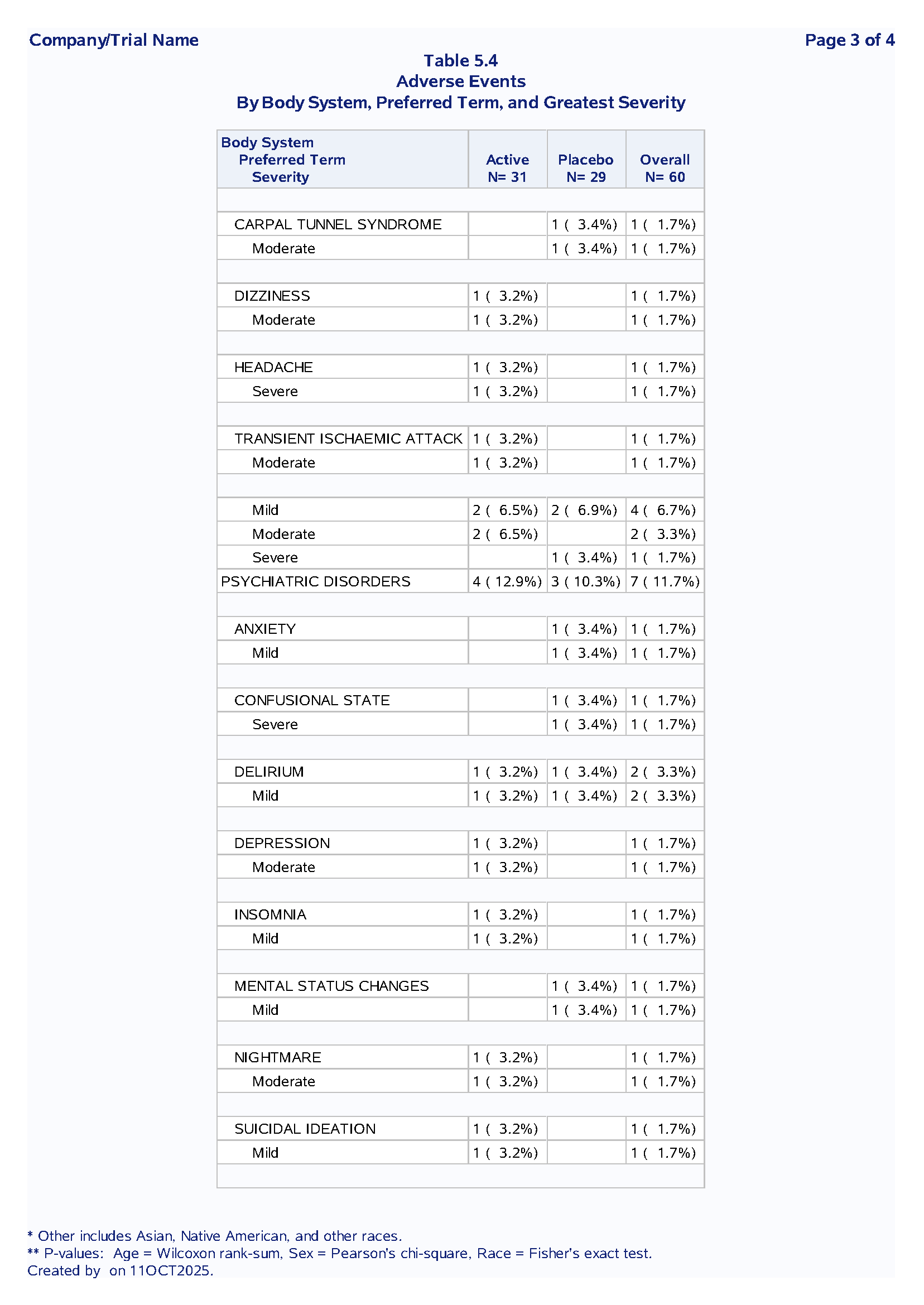 Purpose: Summarize treatment-emergent adverse events by system organ class, preferred term and severity