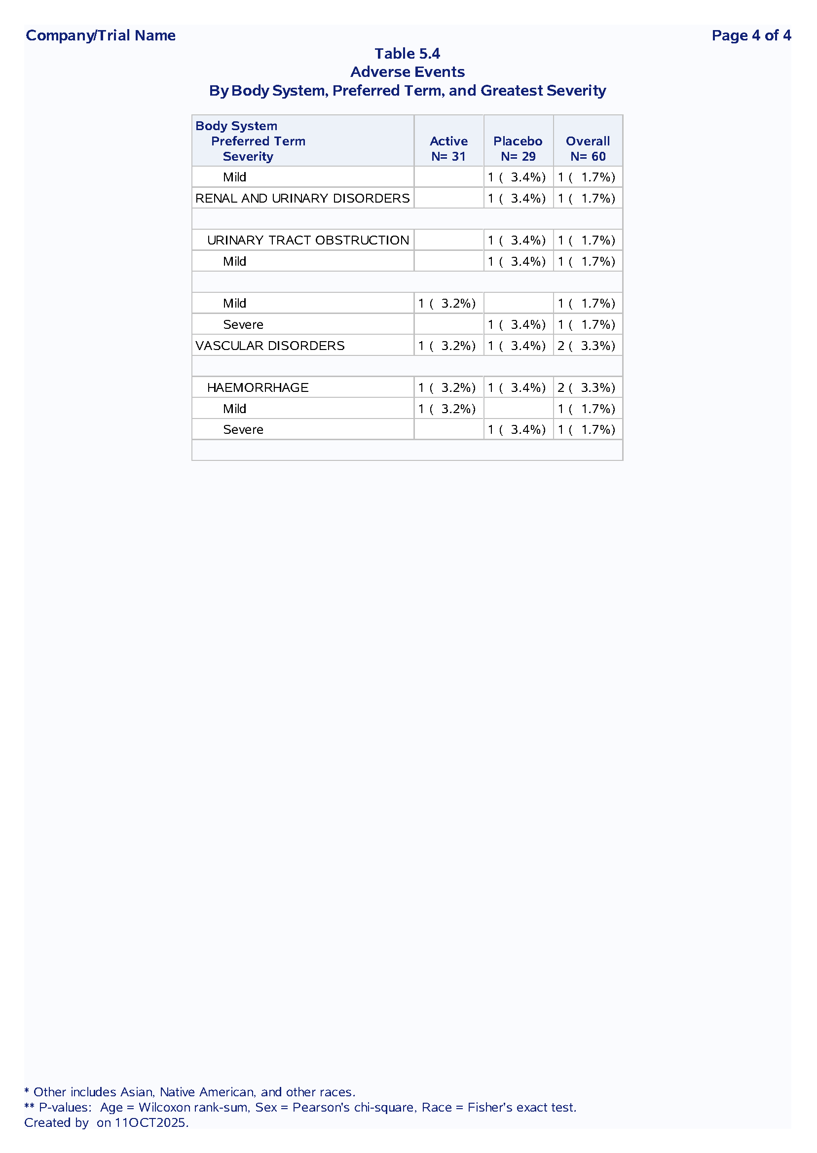 1 Adverse Events Table with nested SOC/PT structure