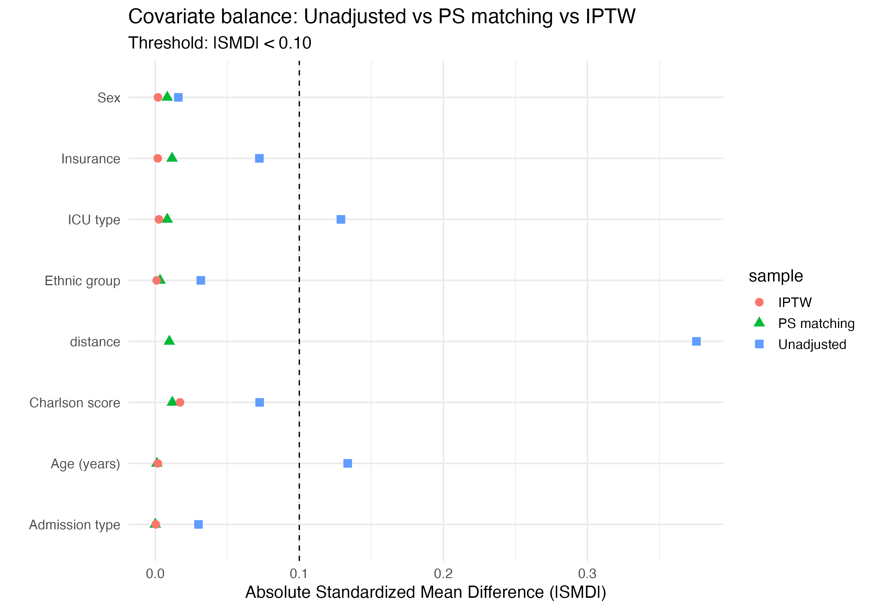 After propensity score matching (PSM) and inverse probability of treatment weighting (IPTW), all baseline covariates achieved adequate balance, with absolute SMDs below 0.10 across all variables (Figure 2).