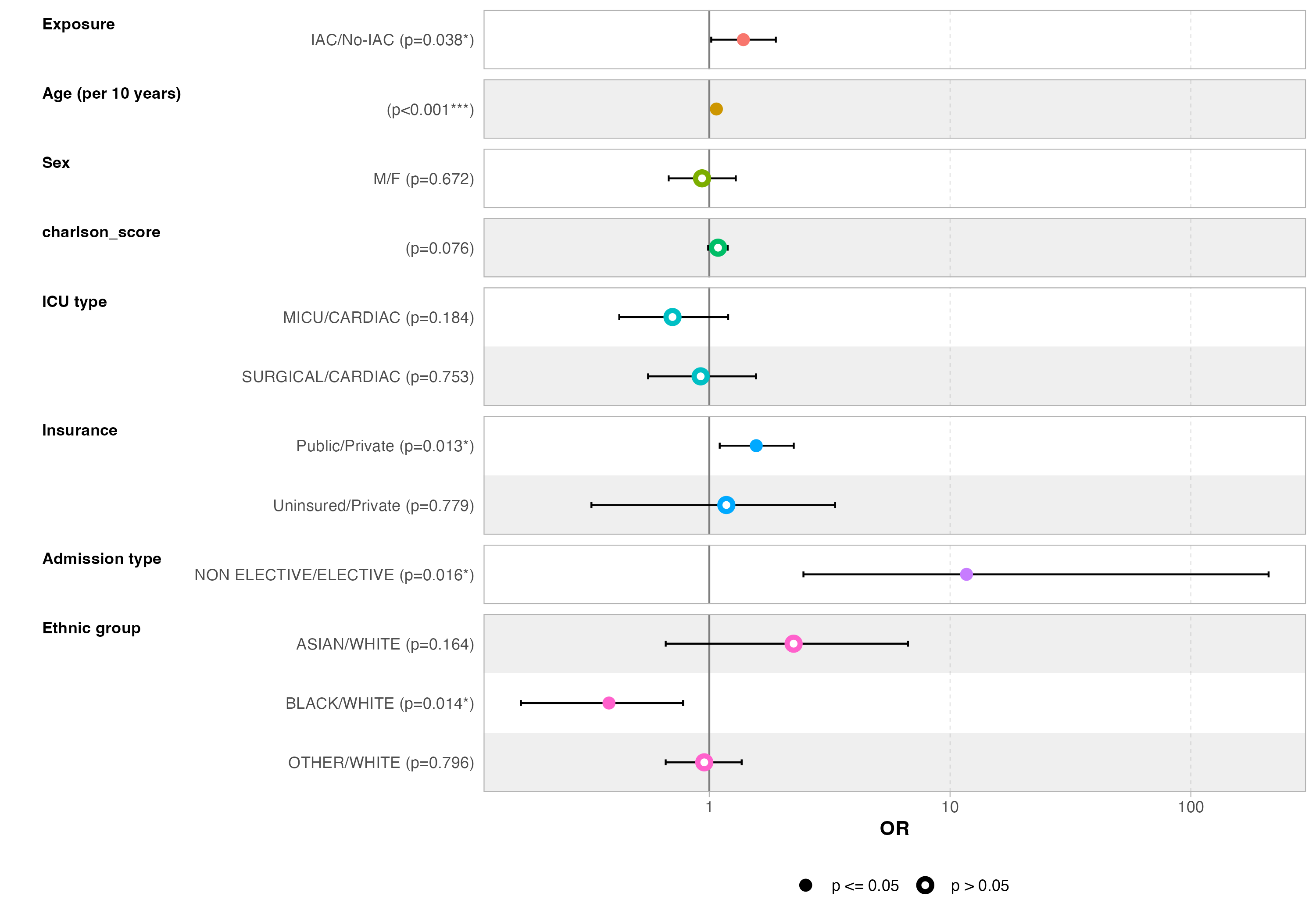 Before any adjustment, baseline characteristics differed between the IAC-exposed and unexposed groups (Table 1), with standardized mean differences (SMDs) ≥ 0.10 observed for several variables, including ICU type, insurance status, and admission type (Figure 2). Specifically, the distribution of ICU types, insurance categories, and admission types differed between exposure groups.